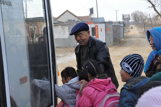 任老師常說雷鋒精神的本質,就是助人為樂。2008年秋,任允好發(fā)現(xiàn)村里的孩子們要在村南十字路口乘車到離村3里外的東軫格莊小學上學,那里地處交通要道,車流量大,又臨近水庫,存在安全隱患。為了讓孩子們安全上下學,他便約上一位老兄弟,每天早晨7點,下午4點30分,準時到路口等候,維持上車秩序,帶領孩子們回家,四年來風雨無阻。去年冬天風雪大,班車無法運行,他對幾位家長說:“咱們護送孩子去學校。”他持锨前面走,雪厚的地方,他用锨搬掉雪,再讓學生們走。當護送到學校后,校長教師深受感動。