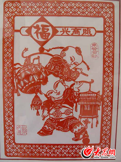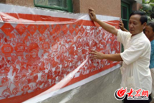 或許對藝術(shù)的執(zhí)著可以幫助我們滌洗掉內(nèi)心的喧囂,讓心境淡泊而寧靜。煩擾算計少了,心中留給快樂的空間便大了。曹老是個知足常樂之人,總是感嘆現(xiàn)在生活日新月異,沒想到自己的剪紙也會有如此被重視的一天。2004年,在全國剪紙比賽中,他為慶祝建國55周年而潛心創(chuàng)作的《喜慶圖》獲銀獎;不久后,他創(chuàng)作的《紅燈記》等8個現(xiàn)代戲戲人物肖像圖,在全國剪紙藝術(shù)節(jié)邀請賽中獲金獎;2005年夏天,他執(zhí)剪的《雄視大千圖》、《百壽圖》等8幅作品,被征集送往法國進(jìn)行文化藝術(shù)交流;2007年盛夏,正值北京奧運前夕,他成功剪出3米長卷《喜迎北京奧運圖》來慶賀這個隆重的節(jié)日;2011年,他的剪紙獲批成為東營市第三批非物質(zhì)文化遺產(chǎn),這些剪刀下的作品和榮譽無一不記載著他一路走來的清晰腳印,也見證著時代的變遷。
