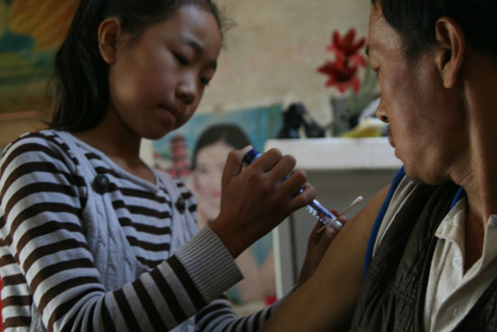為了省錢,他們舍不得到醫院治療,陳長青8歲時就從醫院里學會打針換藥,擔當起爸爸的“專職護士”,每天吃藥打針都在家里進行。現在,陳士泉的糖尿病引起的并發癥越來越多,最嚴重的腎衰竭,只能每天用藥養著。每隔4個小時就得換一次透析液,每天打3次胰島素,輔助藥物10多種,每天費用近300元,陳長青原來飄逸的馬尾辮也被剪成短發為爸爸換成了兩天的藥物。5年來,陳長青基本重復著一個生活流程:每天早晨5:30起床燒開水,用暖水袋將透析液溫至人體溫度,給爸爸灌透析液;然后,給爸爸在胳膊上打一針胰島素,看著爸爸將各種輔助藥吃完;接著,背著書包到離家3里地的學校去上學;中午與下午放學回家后,再重復著早晨的動作,給爸爸打針換藥。懂事的她,常常在學習之余,幫助74歲的爺爺到農田里干農活,幫助72歲的奶奶在家里燒火做飯。