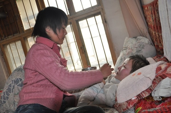 孫悅的皮膚比同齡孩子略顯黝黑和粗糙,坐在人群中間,可能沒有人會特別地注意她。但就是這樣一位不起眼的12歲女孩,卻做出了令人感動不已的事跡。孫悅每天都早早起床,趕在學校上課之前,扶媽媽坐臥起來,然后用打濕的毛巾幫媽媽擦臉擦身。再將煮的軟糯的粥一勺一勺喂給媽媽吃。而自己的早飯多數是就著粥湯吃下一個煎餅了事。中午放學回家趕緊忙著給媽媽做飯嚼飯喂飯,按摩身體,喂藥倒尿,將換洗的衣服浸泡,晚上放學后回家再洗出來。孫悅說,喂飯時不能離嗓子近,那樣會嗆著媽媽。也不能離唇邊近,那樣這口飯會掉落一些,媽媽就吃不到了。