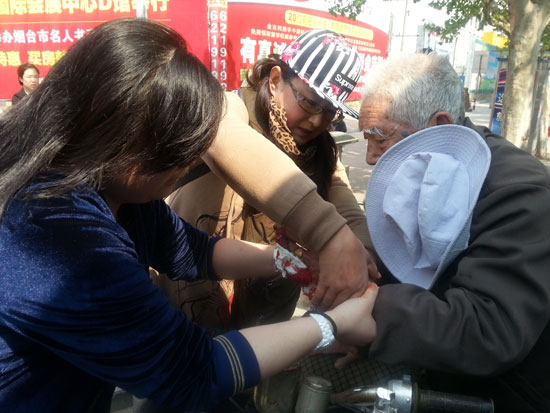 2014年5月12日上午九點(diǎn),西大街和海港路交叉路口出現(xiàn)“奇怪”的一幕:綠燈放行了,一位白頭發(fā)老者,推著一輛三輪摩托車站在路口一動不動。一分鐘,兩分鐘,堵在老人身后的公交車司機(jī)有些按捺不住,“嘀、嘀”地按著喇叭。這大叔怎么不挪步呀?突然老人身體朝車頭位置仰去,老人倒在地上,左手小指和無名指兩根手已經(jīng)在摔倒時(shí)生生被折斷,僅一點(diǎn)點(diǎn)皮肉連著,血不停地往身下滴。快點(diǎn)!快點(diǎn)!”幾乎同時(shí),兩位站在人行道上的女士,飛奔到受傷摔倒的老人身邊。“快拿紙來!誰包里有紙!”一位年齡大概30多歲,頭戴斑馬紋鴨舌帽的女士上前一手掐住老人手腕,一邊仰頭問圍上來的路人。“我這兒有!”一位扎著馬尾辮的姑娘趕緊翻包抽出紙巾遞來。“快!打120!”“我打!”“馬尾姑娘”馬上撥打急救電話。此時(shí),老人好像摔懵了,瘦小的身體不停地顫抖著,眾人將老人扶起。 “家是哪的?打電話聯(lián)系家人!”“馬尾姑娘”詢問老人子女的電話,不停打電話聯(lián)系老人的親屬。“你以后千萬別再騎這個車了,太危險(xiǎn)了!”“鴨舌帽”按著老人滲出鮮血的手,心疼地說。看著老人手指鮮血直流“馬尾姑娘”傷心的哭了。 “來了來了!救護(hù)車來了!”,醫(yī)護(hù)人員到達(dá)現(xiàn)場馬上給老人包扎了傷口。“馬尾姑娘”隨著救護(hù)車一同去了醫(yī)院,圍觀的市民紛紛贊嘆道,“煙臺姑娘好樣的!”“應(yīng)該的,誰遇到了都會伸把手的。”“鴨舌帽”說。整個救人過程“馬尾姑娘”和“鴨舌帽”一直配合默契,記者也以為她們倆人是好朋友。“你那個朋友是哪兒的?”記者向這位“鴨舌帽”打聽道。“我不認(rèn)識她!我們都是路過的。”