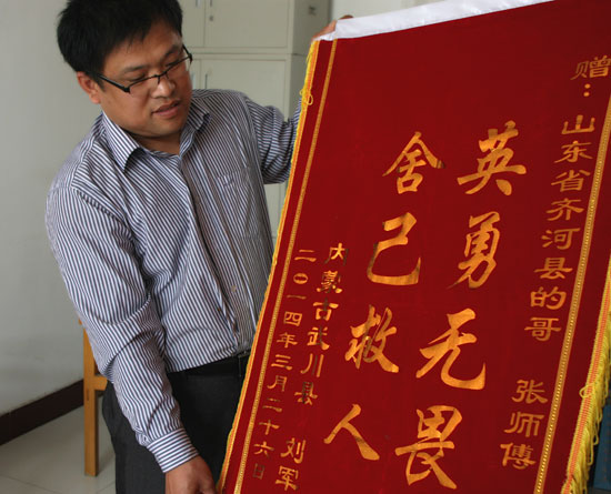 4月11日上午,齊河縣委宣傳部辦公室,意外收到一份來自呼和浩特的郵包,寄件人叫劉軍。里面有他寫的感謝信:感謝齊河的哥張建在呼市挺身而出,救了他的兒子。隨信寄來的,還有一面“英勇無畏,舍己救人”的錦旗。