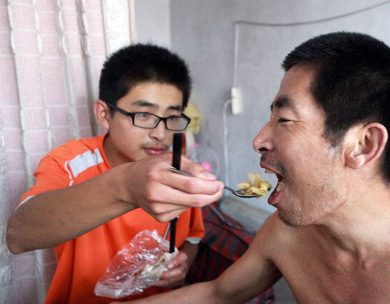 來到大學后,李云龍肩上的擔子并沒有減輕,家庭的貧困,父親的癱瘓讓這個19歲的孩子必須學會精打細算。午飯時間到了,從餐廳買來的一份白菜、三個饅頭就是父子倆的午餐。為了省錢,李云龍和父親一天的生活費控制在13塊錢。雖然只是一份再簡單不過的青菜,父親想讓孩子多吃一點,孩子想讓父親多吃一點,推讓之間,夾菜、喂飯,父子間滿是濃濃的愛意。
