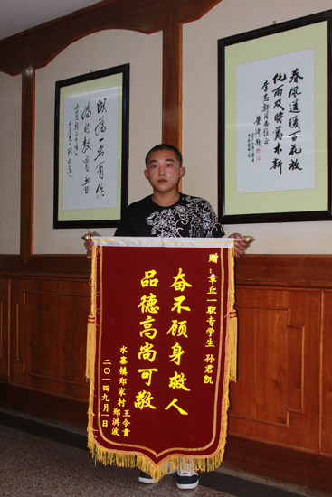 2014年9月2日是一職專新生開學的日子。當天上午8:30,機電專業(yè)新生孫君凱報名后卻又被“召回”學校辦公室。原來,是他在暑假里救起的鄰村兩名少年的家長把錦旗送到了學校里。