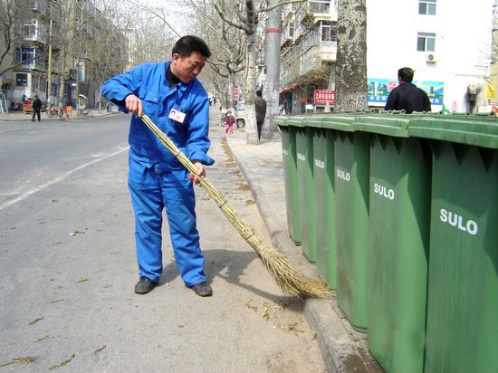 由于保潔工作性質特殊,他經常是費了好大勁把箱體刷凈,把地面掃干凈,前腳還沒走遠,后腳又給丟了一地垃圾,只能重新回來清掃。趙慶武告訴筆者,有一次,他剛剛清掃完一組垃圾箱,還沒等他直起腰來,"吧唧"一聲,從天而降一大包垃圾,連湯帶水地砸在他的后背上,衣服都被湯水濕透了。筆者問,有沒有感到委屈。趙慶武只給了筆者一句話"總有一天人們會理解的。"