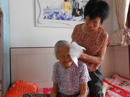 今年96歲的孫淑芝老人雖然眼睛失明、耳朵失聰,但養女滿叢芹細心地呵護著她。 老人住的房間是家中最好最大的正屋,被褥疊得方方正正,物件擺放的整整齊齊。滿從芹剛出生不到40天的孫子和兒媳也只能住偏房,丈夫住廂房。怕母親發生意外,她陪母親睡在同一個炕頭上15年。對于照顧老人,滿從芹覺得并不累,她說媽媽的身子板很好。但在鄉親們眼里,眼瞎了30年的老太太能有這么好的身子板,跟她這個好閨女的悉心照顧是分不開的。每天早晨,滿從芹都會在做好飯后叫媽媽起床,然后給她穿衣、梳洗,喂她吃飯,半上午加餐一頓水果,定期給媽媽洗澡、修剪指甲。在滿從芹的記憶里,最累的時候是媽媽眼睛剛失明的時候,那時父親癱瘓在床長達六年時間,也需要人照顧,她天天"頂著這個喂那個",那滋味跟"下油鍋"一樣。孫淑芝的身體一直很好,但也發生過"險情"。8年前的一個晚上,老人突發心絞痛,滿從芹摸黑跑去給老人買速效救心丸,給老人按摩,直到第二天早晨,老人終于緩了過來,滿從芹喜極而泣。