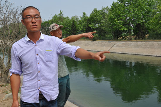 此時,在河堤南側,35歲的牛兆科和他42歲的舅舅王臣誠正在給自家魚塘安裝增氧機。牛兆科突然聽到一聲尖厲的急剎車聲,緊接著他看到一陣塵土飛揚,一個巨大的水花濺了起來。“壞了!有車掉河里去了!”牛兆科第一時間反應過來,他抓起旁邊的尼龍繩和一個耙子,喊起正在幫忙干活的舅舅王臣誠,一路快跑沖上河堤。
