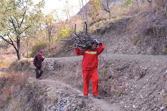 從李單峪村再往里的路,摩托車派不上用場,全部要靠步行。于是工具包、鐵鞋、導線、還有給老人們捎帶的物品全部從摩托車上轉移到了曹永海肩上。4里路,要走30多分鐘,而曹永海背負著保供電的責任,背負著老人們的期盼,在這條路一走就走了15年。