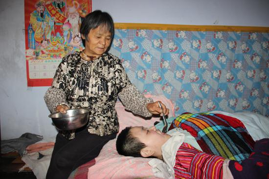 禍不單行,六年前,閆森森的媽媽因腦干出血去世,欠下了八萬元債務。起初是森森的小姑承擔撫養森森的重擔,森森的爸爸拉扯另外兩個孩子。一年后,閆文榮就把森森接到她家,這一住就是五年多。五年來,閆文榮從未離開家超過一小時,因為總怕森森餓了,怕森森尿了、拉了。