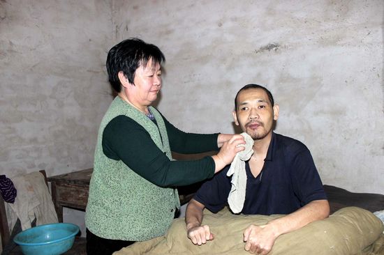 2002年,趙玉蘭退休,可以專心伺候孫源了。然而,幸福在2009年12月13日戛然而止。這天,孫源獨自過馬路時,被一輛疾馳而來的轎車撞飛30多米,鼻子、嘴里都是血,左腿骨折,腦部中度腦震蕩,時而清醒時而糊涂,加之右腿自小無力,只能臥在床上了。自那以后,趙玉蘭再也沒有清閑過,沒睡過一個安穩覺,哪里也去不了。起來一天陪他說話、喂飯喝水、按摩、換尿布,一步也不能離開。“看著孩子這樣,咱受點苦累都不要緊,只要我活一天就照顧孩子一天!”趙玉蘭說。