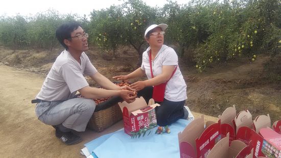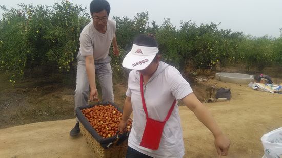 品種培育成功后,夫妻倆立即擴大種植面積。兩人更是將“誠實做人,誠信做事”的理念用在了棗園的經營之中,并一如既往地堅持了下去。鄒均亭、谷詠梅都是個有心人,深知誠信經營的重要性。為了保證大棗品質,夫妻二人從一開始就買大廠家、口碑好的肥料,用他倆的話說:“買大廠家的肥料,心里踏實,這樣長出來的棗子才能品質好,吃起來放心!贝謇镉行┺r戶也想進行新品種的種植,兩人便無條件給他們提供技術支持,幫助他們購置棗樹苗。采購時,夫妻二人總是左挑右選,反復甄別,確保他們購買到優質樹苗。有時一些棗苗在剛接種時會出現一些問題,兩人都是無條件的幫助農戶解決。棗苗如果成活率偏低,倆人還會再從自家的苗木中抽取幾棵給農戶。給自家棗樹噴灑農藥之前,夫妻倆總是反復研究,先在小范圍進行打藥試驗,在經過一段時間,棗樹最低的要藥量確定之后,才在棗園里全部噴灑,最大程度降低農藥殘留,確保棗子的食用安全。他們說:“這大棗都是要給咱老百姓自己吃的,咱不能做黑心買賣,農藥要盡量少殘留,這樣老百姓吃的時候就能更安全。”正是這樣的誠信種植,誠信經營,倆大學生棗園已經成了這十里八鄉的榜樣,用什么化肥,怎么種,這周圍的棗樹種植者都愿意去問問這夫妻倆,大家都說:“這兩口子做人誠信,從來不會騙咱們,聽了他們的建議,咱這棗樹長得是一年比一年好呢!
