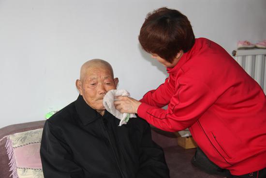今年已90歲高齡的尚禮乾老人是位抗戰老兵,先后參加了濟南戰役、淮海戰役、渡江戰役等。后來,在解放平川島戰役中,老人負傷致殘。1950年復員回家,沒有子女的他一直獨自生活。1990年,牛國紅嫁到大尚村尚金忠家。在得知尚禮乾無依無靠后,她主動要求把老人接到自己家,開始了長達二十四年的悉心照顧。“我伯父一輩子為解放戰爭流血流汗,還負了傷,我不能讓他老了孤苦伶仃一個人。”牛國紅滿含淚水的說。