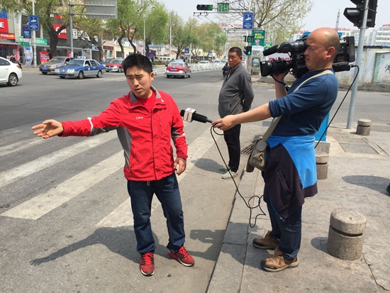 最美路人南山商戶韓慶全(左一)接受青島電視臺采訪。