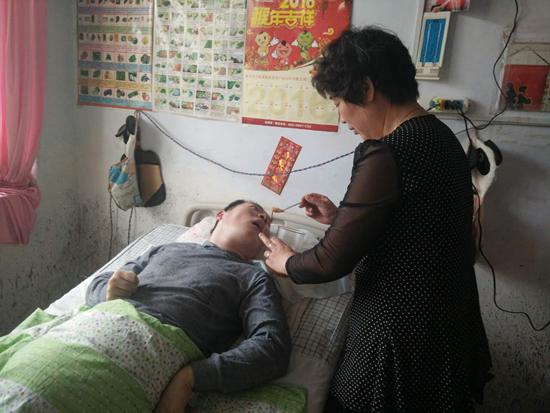 就這樣,她每天早上五點起床給丈夫做飯,給兒子按摩一小時,再給兒子做飯,喂上,夏天給兒子洗澡是最難的時候,兒子一米七八的個子,他身體都僵硬,不會打彎,丈夫未患病以前,還有丈夫一起照顧,丈夫患病后這一切重任就全落在了陶桂玲身上。她把兒子綁在自己身上,硬拉起來,搬到輪椅上,給他洗完澡,再從輪椅上挪到床上。再熱的夏天,再冷的冬天,兒子劉明的身體從未有過褥瘡,沒有過異味,這是連很多親媽都難以做到的,何況還是“后媽”呢。年復一年,日復一日,四千多個日日夜夜,她就這樣照顧著這個破碎的家,無怨無悔。
