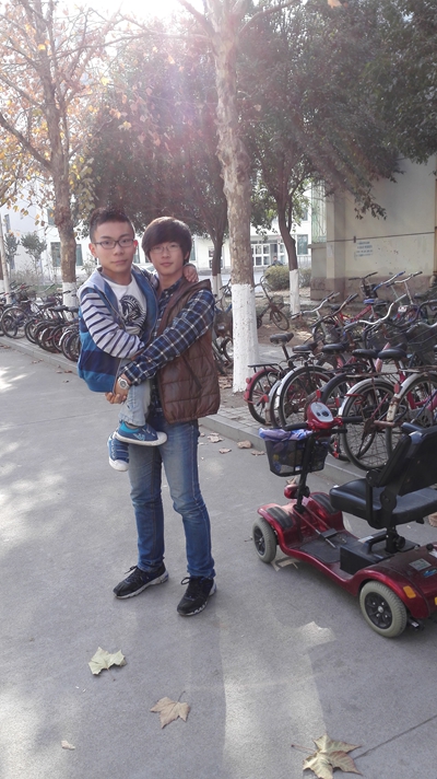 從此,不論清晨還是傍晚,在偌大的校園里都會看到一對形影不離的少年;不管是烈日還是寒風,他都推著輪椅,慢慢地走在校園的擁擠的人流中;在每個樓梯口、餐廳打飯處,都會看到一個或抱或背著同學的少年,盡管他也只不過是個十五六歲、身材消瘦的孩子,卻用盡全力、安全的把徐崇飛準時送到教室。