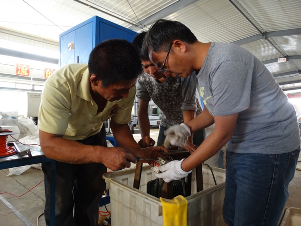 成為總經理的齊孟(右一)現在還在經常和員工一起解決機器故障
