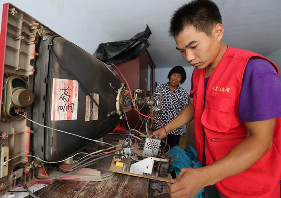 2014年5月,郯城縣青年志愿者協會開展了“快樂星期天·鄰里守望走進紙板廠家屬院”志愿服務活動?吹角嗄曛驹刚邆優樯鐓^居民免費提供健康查體、理發、政策宣傳等豐富多彩的志愿服務。于師傅當場找到了團縣委副書記李真同志,詢問自己雖然自身有殘疾,但是有十多年維修的技術,可不可以成為一名青年志愿者為人民服務。碰巧,這時有居民來詢問可不可以給維修電視、開水壺等小家電時,于師傅就什么也沒說的拿起工具給他們進行免費維修。雖然那天于師傅很忙,也十分的辛苦,一直到下午近三點鐘還沒有吃中午飯。但是,看到那么多人因為于師傅的志愿服務而解決了問題,聽到社區居民說謝謝的時候,我們都能清楚地感覺到于師傅心里的那份甜蜜。就這樣,于師傅光榮地成為了一名青年志愿者。2014年以來,于師傅與青年志愿者協會一起先后走進了東城社區、酒廠家屬院、馬東社區、紅花埠社區等城市工人社區和農村居民社區26個,免費維修維護冰箱、洗衣機、電風扇等家用電器900余件,免費維修水壺、電飯煲、插排等小家電2800余個,服務社區居民2200余人,受到了群眾們好評,也贏得了廣大志愿者的普遍贊譽。在為社區居民維修家電的同時,于師傅還是一名情系夕陽關愛孤寡老人青年志愿者,長期為馬頭、花園等4個養老院免費維修家電,并在店里生意不是很忙的時候,帶著兒子于豐毅來到養老院親情陪伴,為孤寡老人包餃子、聊天、打掃衛生。