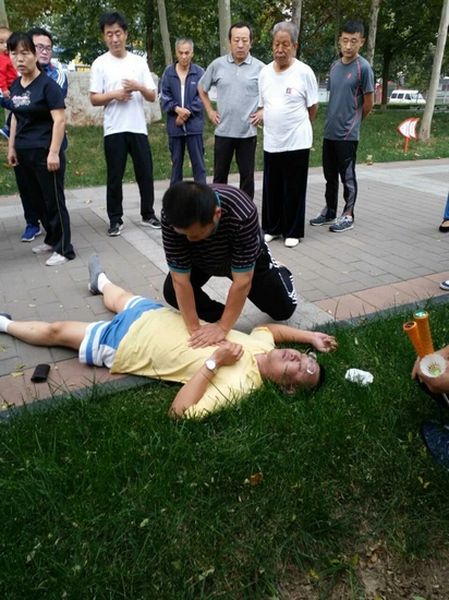 挺身而出 積極施救 2016年9月27日早上6:40時(shí)許,秋日的氣溫已經(jīng)有些偏低。從外地到淄博高青縣工作的閆澤強(qiáng)在蘆湖公園晨練跑步過程中突感身體不適,一下子癱倒在跑道上。旁邊的市民見狀,詢問要不要撥打120救治,閆澤強(qiáng)擺了擺手,并試圖站起來。但是他并未站穩(wěn),就仰面躺在了路邊的草叢中,徹底喪失了意識(shí),隨身攜帶的眼鏡和鑰匙也散落在一邊。看到陌生人暈倒,很多晨練的人就慢慢圍攏了過來,有的市民還想和他對(duì)話,但是沒有任何反應(yīng)。此時(shí),也正在附近晨練打球的高青縣市民陳磊見此情景,也趕緊跑到出事現(xiàn)場(chǎng)。當(dāng)看到圍觀的市民對(duì)患者救治一愁莫展時(shí),出身中醫(yī)世家的陳磊,懂得一些醫(yī)學(xué)救護(hù)常識(shí),看到這突發(fā)情況,判斷患者有可能遭遇到了危重病癥,便立即展開緊急施救。