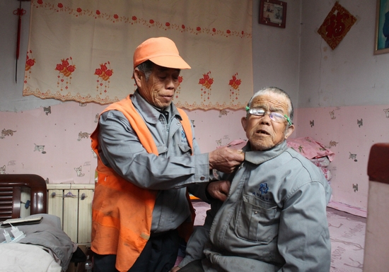 曲立莊(左)在幫助叔叔穿衣服