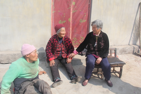 韓邦英老人(右一)與孫姚氏娘倆曬太陽拉家常