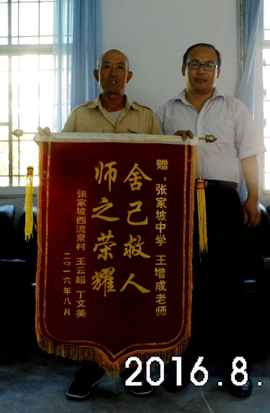當(dāng)家長(zhǎng)從王增成老師的手中接過(guò)安全脫險(xiǎn)的孩子時(shí),十分高興。而此刻的王增成老師,卻不聲不響地離開(kāi)了現(xiàn)場(chǎng)。暑假開(kāi)學(xué)后,孩子的家長(zhǎng)找到了學(xué)校,給王增成老師送去了感謝信和錦旗,孩子的家長(zhǎng)對(duì)學(xué)校負(fù)責(zé)人言明,他一定要對(duì)王增成老師表達(dá)他的謝意時(shí),王老師的救人事跡這才得以讓大家知曉。