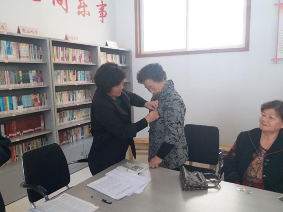 王秀一(左一)帶頭給黨員上黨課,為社區老黨員佩戴黨徽,增強了黨員的黨性修養和政治覺悟。