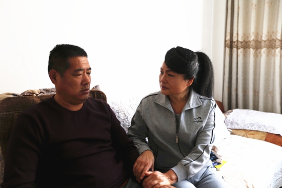天氣最熱的時候,馬秀榮每天堅持為丈夫擦洗身子。為了避免長褥瘡,晚上每隔一小時,她就起床幫丈夫翻一次身。每次吃飯,馬秀榮都先用自己瘦弱的肩膀頂著身材魁梧的丈夫坐起來,端起小碗將飯菜送到丈夫嘴邊。有時候,為了“搬”丈夫到沙發(fā)上坐坐,從床頭到沙發(fā)近在咫尺的距離卻能摔個跟頭。熬不住的時候,馬秀榮也會背著丈夫偷偷流眼淚,但是,她擦干了眼淚,又換上笑容……