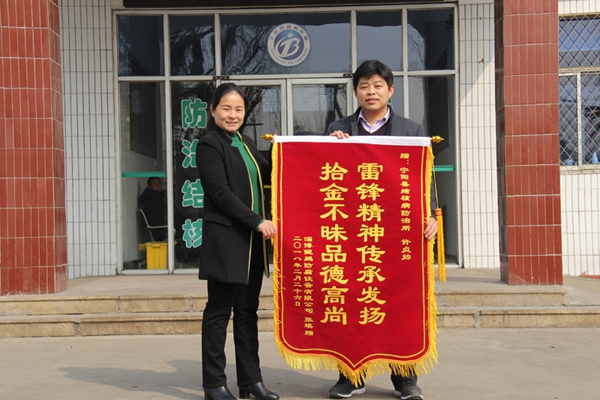 2018年2月26日,鄉飲的朱女士來到寧陽縣結核病防治所,將一面寫有“雷鋒精神傳承發揚,拾金不昧品德高尚”字樣的錦旗贈送給結防所工作人員許貞帥,以此來感謝許貞帥讓她弟弟的錢包失而復得。