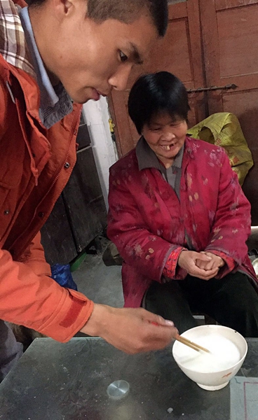 春去冬來、寒來暑往,于書紀始終堅定地照顧患有智力殘疾的母親生活。冬天怕母親凍著,他特意從集市上買回取暖袋放在她胸口,一有空,他就把母親領到戶外,讓她好好享受一下陽光;夏天,他又特意在她床頭安裝了一臺小電扇,多年來,為讓母親和父親生活得好些,他從未添置過一件衣服,身上的衣服都是別人送的大半新衣服。為支撐這個貧寒的家庭,悉心照料好心愛的母親,于書紀放棄了原先在南方一家電子廠打工的豐厚待遇,雞蛋除每天給母親補補身上外,他從沒有舍得吃。書紀經常做白菜炒肉,特意將白菜切得很碎。母親的牙齒不好,每次做飯的時候都很注意。做飯、洗衣服、梳頭,將母親生活的小細節照顧得非常周到。