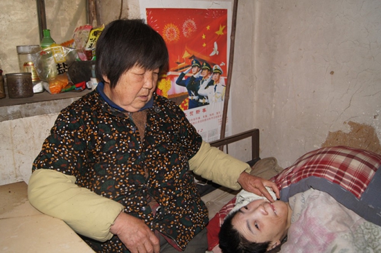 如今已經(jīng)39歲的周脈鳳依然像個嬰兒,整天躺在床上,吃喝拉尿全靠母親照料,為了照顧好女兒,江桂英每天都要起很早,先把女兒喂飽了,自己才不管涼熱隨便吃點再下地干活。擔(dān)心女兒拉了、尿了受罪,一個上午要回家看兩次。為了照顧女兒,39年來,江桂英沒在親戚留宿過,沒有趕過廟會。每天晚上,他都要起來三、四次給女兒換尿布,一年365天,天天如此。冬天屋里冷,她都是和衣而睡,39年來,她沒有睡過一個囫圇覺,沒有吃過一頓熱乎飯,夏天怕女兒暑熱生病或被蚊蟲叮咬,她給女兒撒上滑石粉,并早早撐上蚊帳。冬天,怕女兒受涼,她給女兒灌上三個燙壺,頭上、腳上、后背上每處一個。怕女兒常年臥床會生褥瘡,她每天堅持給女兒翻身三、四次,每次都累得她氣喘吁吁,出一身汗。