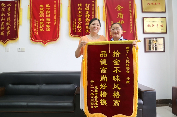 2018年5月,仲燕同志送孩子返濟途中,在鄒平服務區撿到一個手提包,內有兩個身份證、一個手機和三萬多現金,后幾經查找,終于與失主取得聯系,失主萬分著急,已經到達章丘刁鎮,準備折返回來查找。為了讓失主放心,仲燕同志告訴失主自己是警察,讓其放心,并叮囑她在原地耐心等待,第一時間駕車幾十公里趕到章丘刁鎮,經與失主現場確認,核對信息無誤后,將錢物當場交還失主。失主執意拿出部分錢表示感謝,被仲燕同志婉言謝絕。失主遲女士經過多方打聽,終于知道了仲燕同志的單位,于6月4日專程帶著錦旗到食藥環偵支隊,對仲燕同志表示衷心感謝,同時也對濟南市公安局培養出仲燕這樣的好民警表示由衷的贊許。6月5日,《齊魯晚報》《生活日報》《近報》等通過新媒體平臺對仲燕同志的事跡進行了集中宣傳報道;6月6日,濟南電視臺新聞頻道《今晚》欄目記者對仲燕進行專題采訪,同時通過電話連線,失主再次表達對仲燕同志的感激之情。