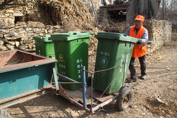 劉賢康干華家宅村居保潔不幾天,發現街巷太窄,垃圾清運車無法通行,村巷里的垃圾桶沒法清運。街路石頭挨石頭,坑坑洼洼,生活垃圾桶下面的兩個桶輪太小,到處卡碰,垃圾桶里裝滿生活垃圾搬不動也抬不走。又因垃圾桶弄不動,垃圾清運不及時,村民新產生的生活垃圾不得不堆的桶外滿地都是。面對困難劉賢康沒有消沉,他走路、吃飯、睡覺滿腦子都裝著垃圾、垃圾桶、拉垃圾桶的事,經過連續多日的研究摸索,他有了一個大膽的設想,我能不能自己制作一個工具,來代替垃圾桶下面的兩個輪,只要垃圾桶能拖到村口的柏油公路上,村里的垃圾清運就迎刃而解了。他把垃圾桶尺寸量好,找兒子幫著研究、設計和制作拖桶工具,在兒子、媳婦等一家人的全面配合下,很快一個劉賢康家人自制的山區村生活垃圾桶拖桶專用工具做成了。專用拖桶工具是用由四根鋼管焊接成長方形底框,底鋪一塊半公分厚的鋼板,四角豎直焊接四根鋼筋,用鋼筋前、左、右焊接成三條盛桶框,后面有一根活動鋼筋固定,托盤前端焊有連接口與手扶拖拉機車斗后方的連接攔桿相連。當分散在村街胡同的生活垃圾桶滿后,劉賢康只須開著自家的手扶拖拉機掛上垃圾桶托運工具,繞村街胡同轉上一圈,即可很快將垃圾桶拖運到村口柏油路邊,讓柘山環衛所的垃圾清運車及時將垃圾清運干凈。