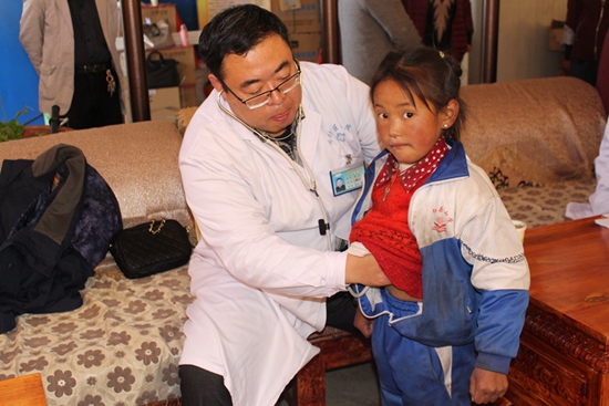 為改善困難群眾生活,袁虎和其他援藏同志積極開(kāi)展扶貧捐款活動(dòng)。那時(shí)他們剛到昂仁尚不足一個(gè)月,還沒(méi)發(fā)工資,他從隨身現(xiàn)金中拿出500元捐給了昂仁的困難群眾。在集中結(jié)對(duì)幫扶活動(dòng)中,袁虎與日吾其鄉(xiāng)央確村的貧困群眾索朗一家結(jié)成幫扶對(duì)子,一有時(shí)間就帶著油、面到他家去看看,竭盡全力幫助他們解決困難。在工作組統(tǒng)一安排下,袁虎發(fā)動(dòng)自己的親朋好友和原單位同事,為昂仁縣中小學(xué)學(xué)生開(kāi)展捐獻(xiàn)“愛(ài)心棉衣”“暖心鞋”活動(dòng)。他所在的周村區(qū)第二人民醫(yī)院,200余職工捐助衣物近千件。他愛(ài)人也買(mǎi)了1000多元的嶄新棉衣寄到昂仁,還帶著他6歲的兒子到捐贈(zèng)處義務(wù)勞動(dòng)。