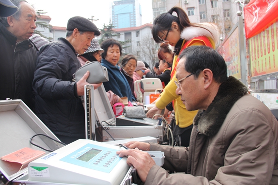 王海濤帶領青年職工走進社區為居民免費檢測血壓計