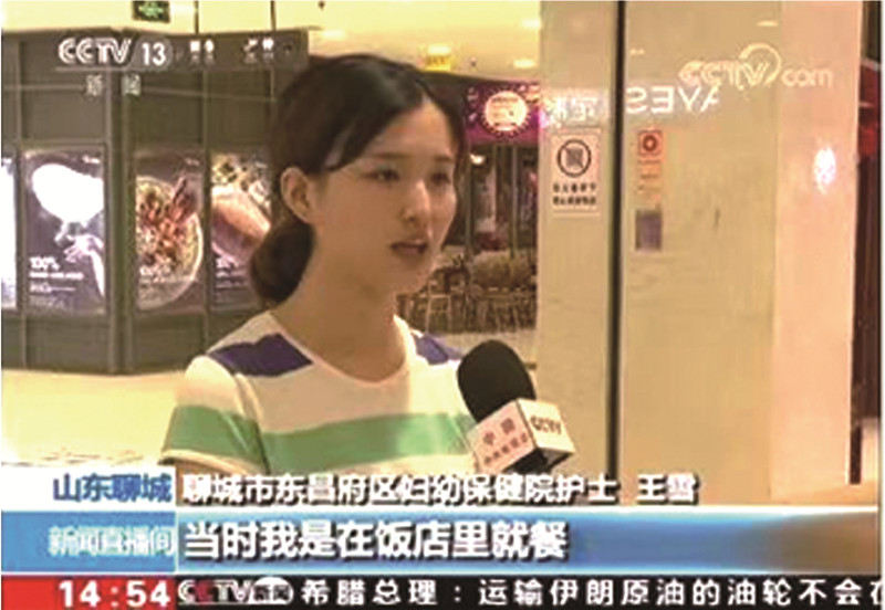 2019年8月18日周日晚上,王雪和家人去商場就餐時,聽到鄰桌小女生告訴她媽媽“外面有人暈倒了!”。王雪立刻出去查看,當時見一名女子平躺在地上,王雪解釋自己是一名護士,便立即靠近女子了解情況,當時已觸不到女子的頸動脈,她讓工作人員撥打120,并立即對女子進行胸外按壓。
