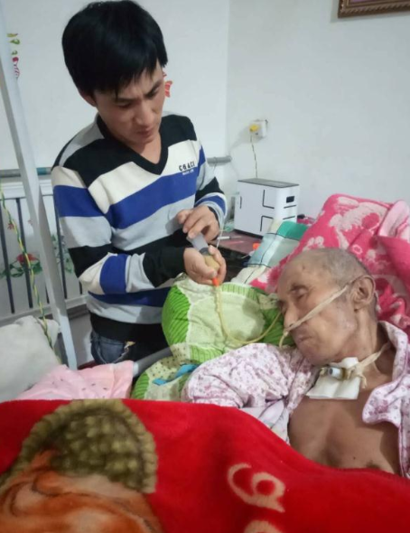 出院后,為了更好的照顧大伯,李衛波和妻子執意將大伯接回自己家,并特意為大伯騰出一間房子,做了新被子安裝了新窗簾。出院后的大伯,就像嬰兒一樣臥床不起,為使大伯呼吸順暢臥床舒服些,李衛波給大伯購買了制氧機和陪護床。每天清晨5點多,李衛波早早地起床,給大伯漱口、洗臉,換尿不濕。大伯只能吃流食,李善燕特意去縣城購買了食品料理機,為了給大伯適當的增加營養,李善燕經常換著花樣的將飯菜、水果加工成泥狀,用吸管打給大伯吃。像大伯這樣的病人,醫生叮囑每天都需要給他擦身以防止褥瘡,于是李衛波兩口子每兩小時就給大伯翻一次身,以盡可能刺激他的軀體,經常給他按摩以防止全身肌肉萎縮。出院后的大伯,需要常年吃藥維持生命,為了養家糊口,李衛波白天還要出去打工,為方便妻子一人在家照顧大伯,李衛波給大伯買了升降機,方便給大伯擦洗身子。晚上,李衛波把沙發放在大伯的床邊,伺候大伯安睡以后,自己才在沙發上和衣而臥。李衛波欣慰的說“每天晚上看著大伯靜靜的睡著后,我的心里也踏實多了。”對他來說,最難的是每天幫大伯清理大便。由于常年臥床,大伯很容易導致便秘,有時候用開塞露也無效,李衛波就直接用手去摳,以減輕大伯的痛苦。每次給大伯清理完大便,李衛波都會出一身的汗。