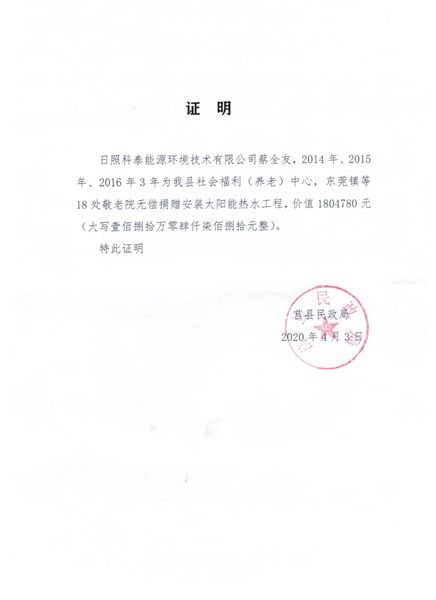 2014年,一個偶然的機會中,蔡全友得知莒縣各個鄉鎮的敬老院還沒有安裝太陽能,老人們冬天無法用熱水洗浴。聽到這個消息,聯想到了自己過去經歷的苦日子,從事太陽能安裝的蔡全友心里揪了一下。蔡全友決定奉獻自己的一份力,讓敬老院里的老人們洗上熱水澡。他主動聯系上了縣民政局,爭引到了公共場所太陽能工程安裝項目,帶著施工隊挨個鄉鎮敬老院查看施工環境,制定施工方案,不分晝夜地忙碌著。2014年至2016年間,蔡全友捐贈180余萬元,為莒縣鄉鎮16處敬老院捐贈太陽能熱水工程,每處可滿足100多位老人的洗浴及生活熱水;為莒縣社會福利養老中心捐贈太陽能熱水工程,可提供800位老人的洗浴及生活熱水。