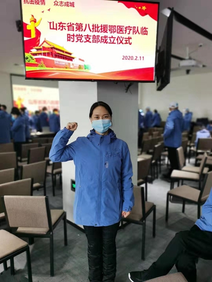 2020年2月11日,耿艷菲在武漢漢陽參加山東省第八批援鄂醫療隊臨時黨支部成立儀式,充分發揮黨員先鋒模范作用,堅決打贏疫情防控阻擊戰。