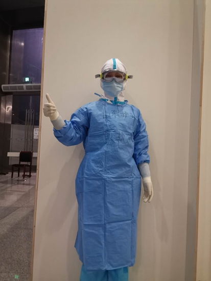 耿艷菲身著防護服在武漢方艙醫院。