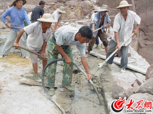 2005年3月16日,工程正式動工。第一天動工就發生了一件令人意想不到的事情。由于山高路遠,駕駛打眼機的工人不小心連人帶車翻到了山路邊的干塘里,人被重重地壓在車底下。雖然人并無大礙,但工人再也不愿干下去了。困難一個個接踵而來。“沙料石料,幾天漲次價,常常需要重新工程預算;趕上麥收農忙,勞動力緊張也頗費腦筋;遇上下雨天,更是擔心得要命,生怕雨水沖毀了壩基、淹了器具。”
