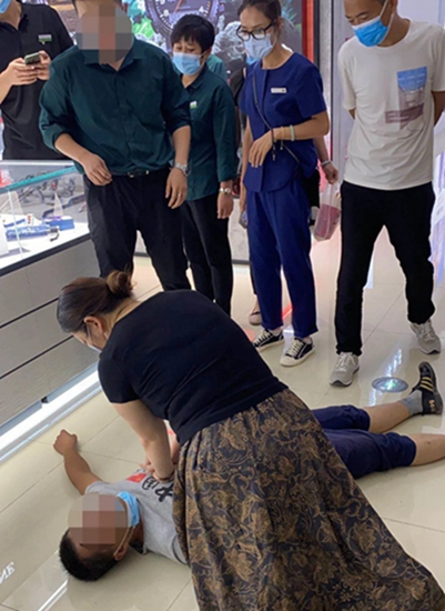 2020年9月7日,沈曉玉在淄博市信譽樓商場購物,準備下樓梯往回走時,剛到二樓電梯口,突然聽到“啊”的一聲,隨即看到一名年輕男子,躺在地上,手腳抽搐,職業的敏感使她意識到男子肯定突發某種疾病,非常危險。她立即跑過去查看,同時向周圍的人群表明自己醫務人員的身份,讓大家不要靠得太近,給患者留出足夠的空間,確保空氣流通。此時躺在地上的男子已停止抽搐,沒有了意識,拍打身體也無反應,她趕緊觸摸男子的頸動脈,已沒有了搏動。沈曉玉心里“咯噔”一下,“不好,需要立即搶救!”時間就是生命,她迅速為患者清理口鼻腔分泌物,立刻開放氣道為其實施心肺復蘇,并讓圍觀群眾抓緊時間撥打120 。經過兩分多鐘的緊張搶救,硬生生將該男子從死亡線拉了回來,男子心臟終于又開始搏動并有了自主呼吸。