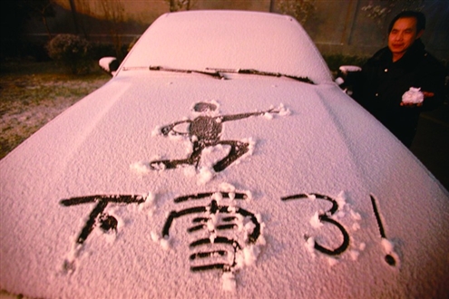 昨日,省城一位市民在雪后車上畫了“航母Style”的標志性動作記者鄭濤攝