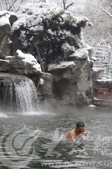 今天上午9點(diǎn),記者來到了護(hù)城河邊上的濟(jì)南泉水浴場,五六位冬泳愛好者已經(jīng)穿上泳衣在池邊做熱身運(yùn)動。一位常年參加冬泳訓(xùn)練的王先生告訴記者,在雪天里游泳是件特別“爽”的事兒,在泉水里一點(diǎn)兒都不冷。