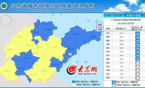 其中,作為環境監測的一個綜合數據,在環境空氣能見度顯示圖上,記者發現,濟寧為23.7KM、威海22.7KM、青島21.8KM位列全省前三位。另外,在全省總體能見度分布圖上,除了上述3個城市,東營、煙臺、日照、濱州和泰安也被標注為藍色區域,表明昨天一天我省17地市中,有8市總體環境能見度達到了“藍天白云、繁星閃爍”的標準。