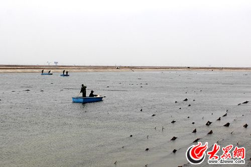 每個海參池的池深在一米半以上,上午正好趕上不少養殖戶正在進行捕撈作業。(馬鑫 攝)