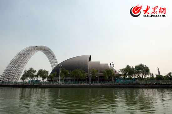 沿著波光粼粼的東昌湖南岸一路向東行進,下午17時左右,記者便來到了這個座落在湖南岸的水城明珠大劇場。和它的名字一樣,遠遠望去,圓形的劇場像是一顆正要從湖水中升起來的明珠,讓人誤以為它一半在空中,一般在水里。