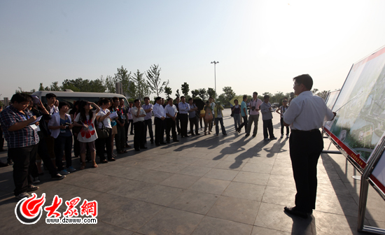 采訪團參觀了菏澤市大劇院和演武樓,菏澤市規劃局副局長尹茂林介紹情況。(盛堃 攝影)