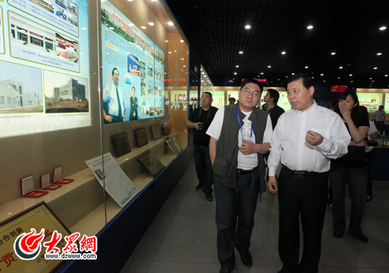 菏澤市委常委、宣傳部長王永江(右)和大眾網(wǎng)總編輯朱德泉(左)一同參觀山東步長制藥有限公司。(盛堃 攝影)