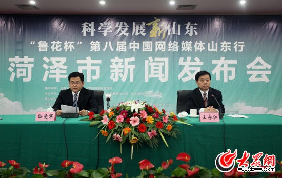 菏澤市委副書記、市長孫愛軍出席科學發展新山東——“魯花杯”第八屆中國網絡媒體山東行菏澤市新聞發布會。(盛堃 攝影)