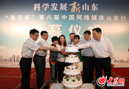 科學發展新山東——“魯花杯”第八屆網絡媒體山東行閉幕儀式上,主辦方為5月份過生日的采訪團成員慶生。(盛堃 攝影)